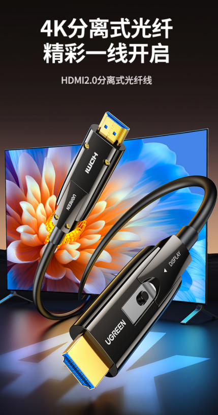 那么有没有可以满足多设备连接的光纤hdmi线?答案是肯定有的。虽然无法在端口的传输上进行设计,那直接在端口进行多接口的设置,就可以实现一根线灵活连接不同设备,也就是所谓的——分离式光纤hdmi线。