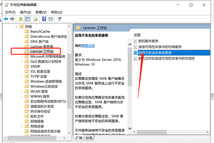 4.更改本地组策略。运行 gpedit.msc打开本地组策略,找到计算机配置-管理模板-网络-lanman工作站中的不安全的来宾登录,启用该配置。
