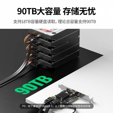 绿联cm528是一款主机pci-e转sata五口扩展卡。扩展卡配备5个sata3.0接口,符合pci-e3.0规范,单口支持18tb大容量硬盘读取;同时采用jmb585强劲芯片,理论传输高达6gbps,让传输又快又稳,主机扩展更强劲。